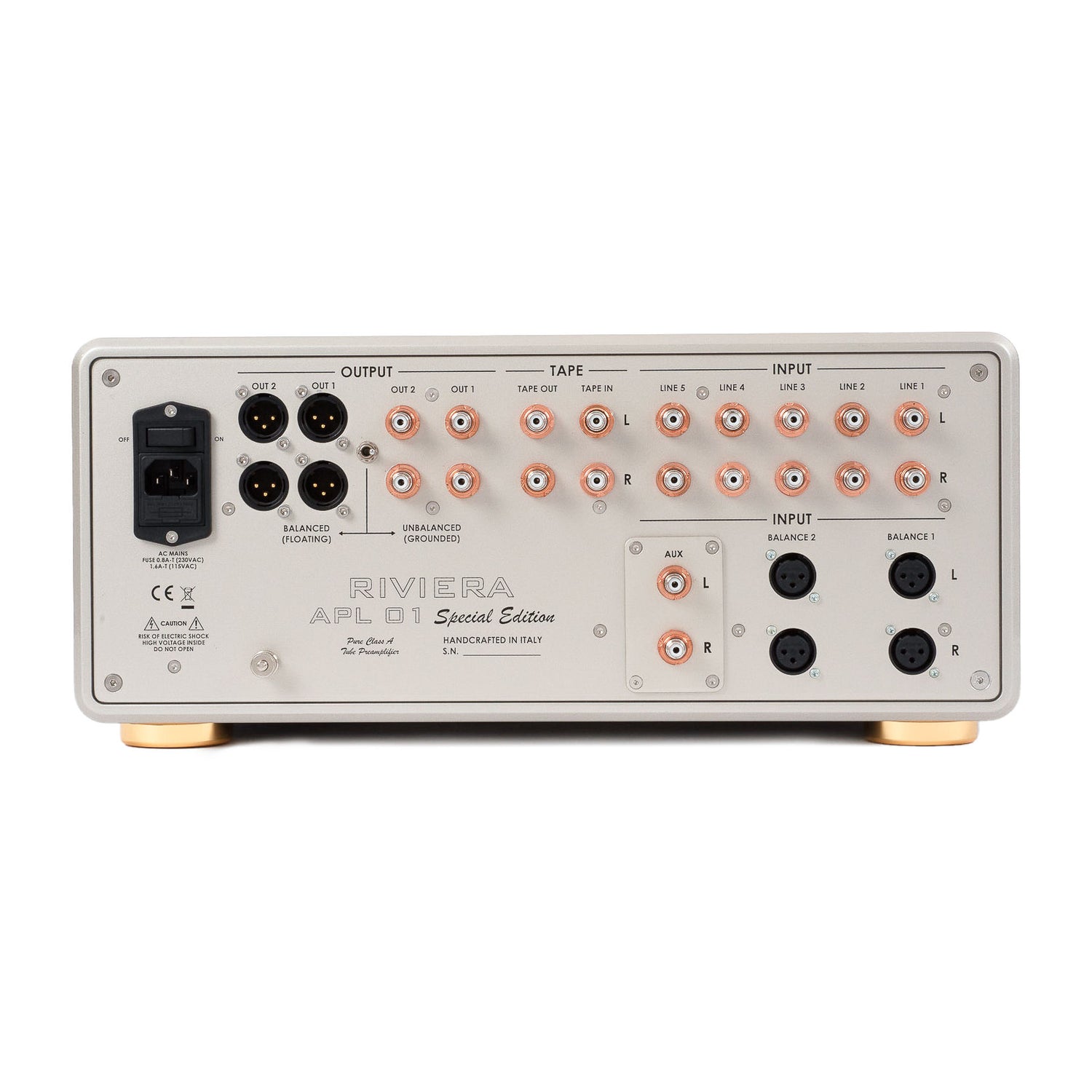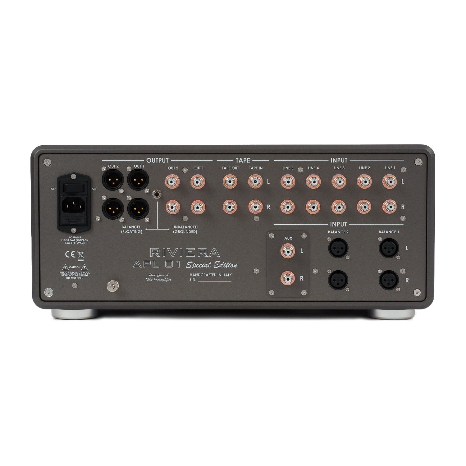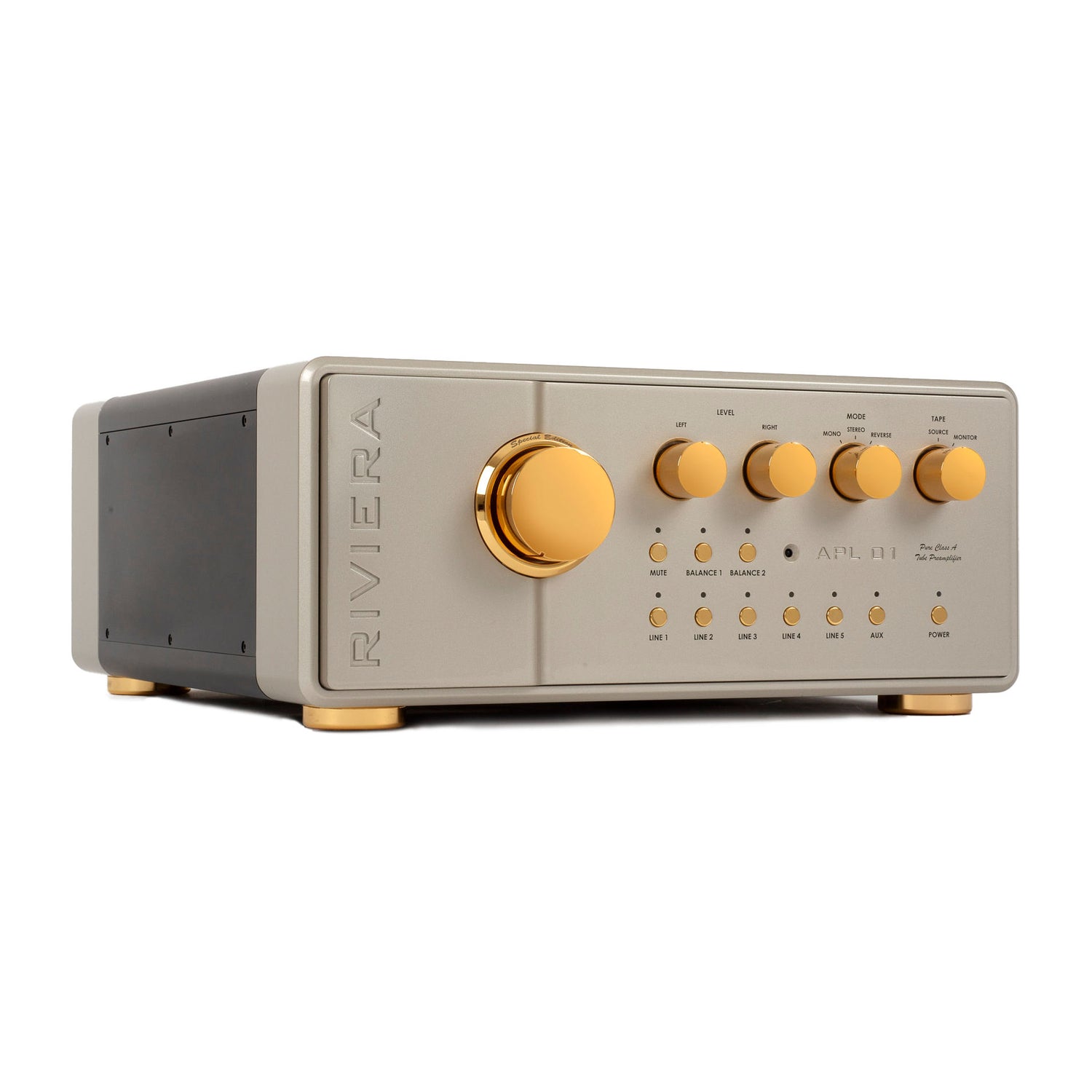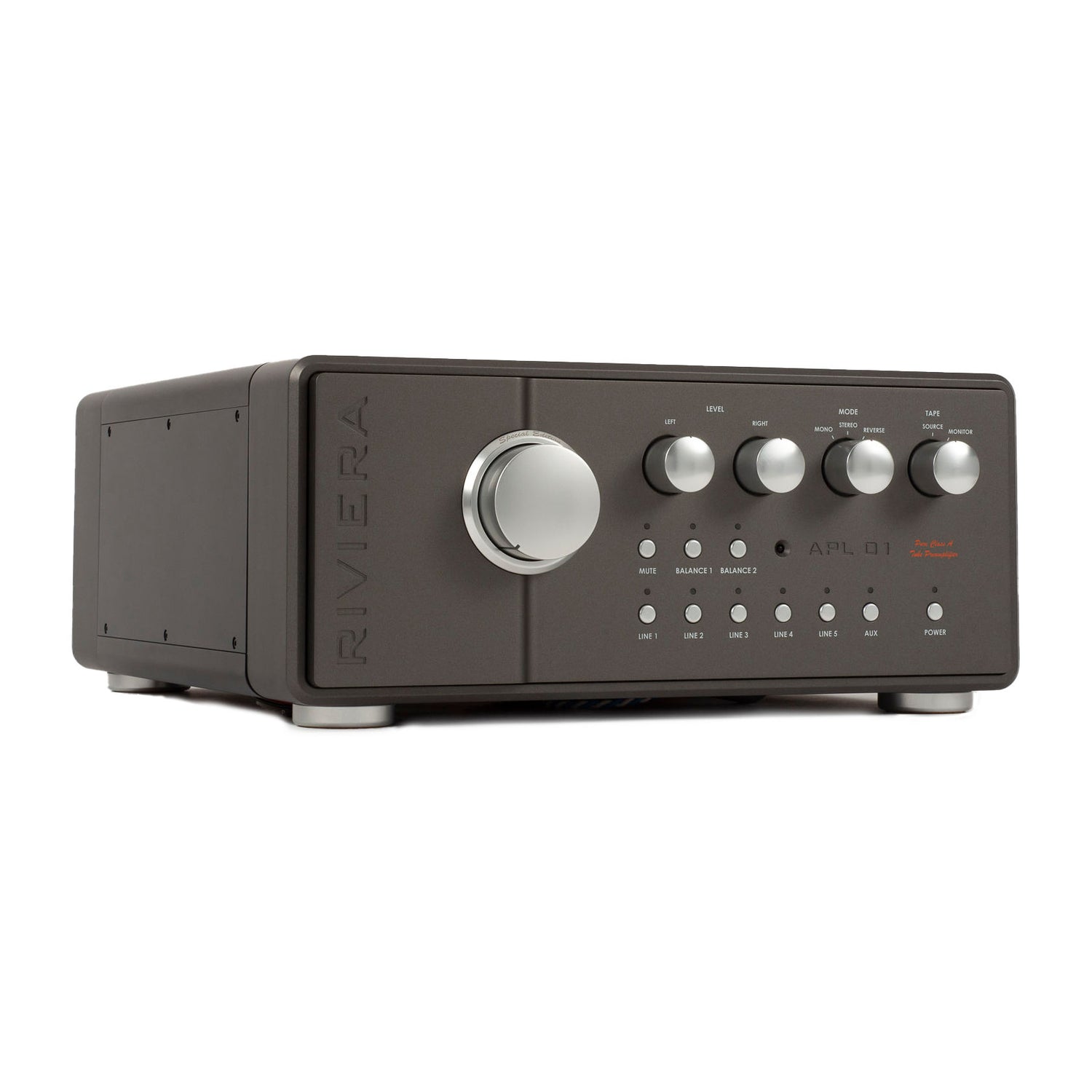 Innerhalb der Riviera Line-Preamplifier steht die APL01 Special Edition als aufwendig konstruierte Referenz-Vorstufe. Der Hersteller beschreibt sie als ultimativen Ausdruck der eigenen Vorstufen-Expertise und betont die konsequente Auslegung auf ein Referenz-Ergebnis. Optisch und mechanisch ist das Konzept klar luxuriös: ein schweres Chassis mit zahlreichen Teilen aus massiv gefrästem Aluminium. Als Ausführungen sind Gold und Dark Titanium vorgesehen. Ein konfigurierbarer Aux-Eingang erlaubt zusätzliche Systemanpassung, ohne dass Riviera die konkrete Belegung im Detail festlegt.