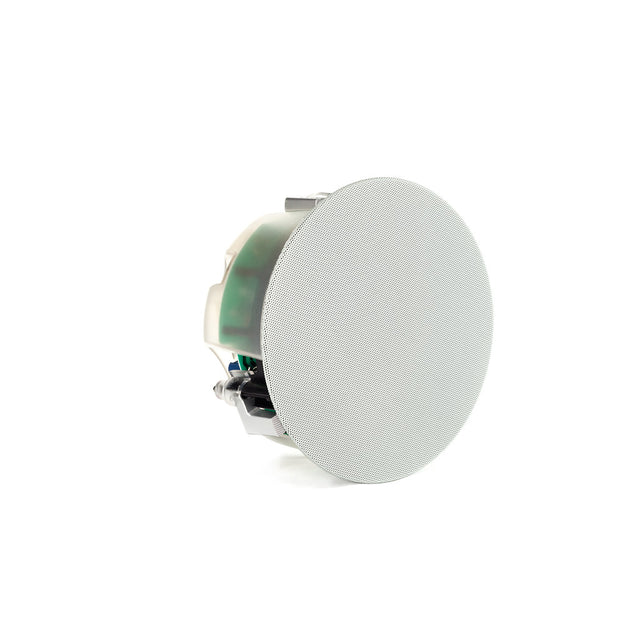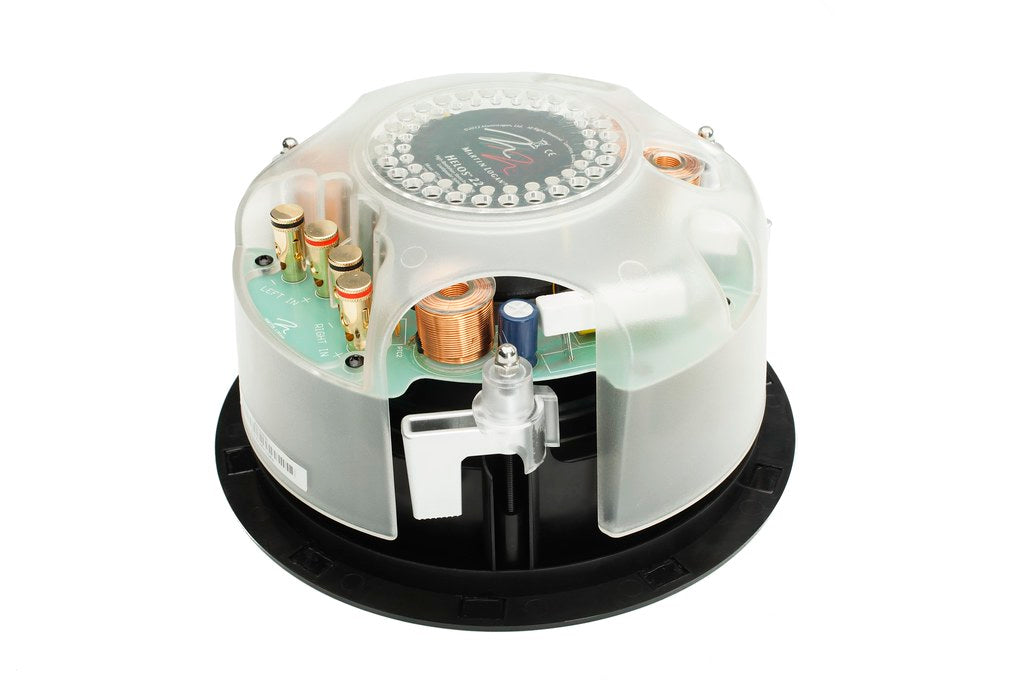 Der Helos 22 liefert echten Stereo-Klang (L/R) aus nur einem In-Ceiling-Lautsprecher: Zwei 0,75″-Neodym-Hochtöner spielen die beiden Kanäle, ein 6,5″-Doppelschwingspulen-Woofer mit steifer Aluminium-Membran übernimmt den Bass/Grundton. Der schwenkbare Hochtöner-Vorbau erlaubt die Ausrichtung auf den Hörbereich; ein ultraflacher, lackierbarer Micro-Perf-Magnetgrill und das robuste Montage-Lock-System sorgen für schnelle, nahezu unsichtbare Integration. Per Brücke lässt sich der Helos 22 alternativ im Mono-Modus mit breiter Abstrahlung betreiben. Die präzise Vojtko™-Weiche mit hochwertigen Luftspulen und Polyester-Folienkondensatoren bewahrt feine Details und Dynamik.