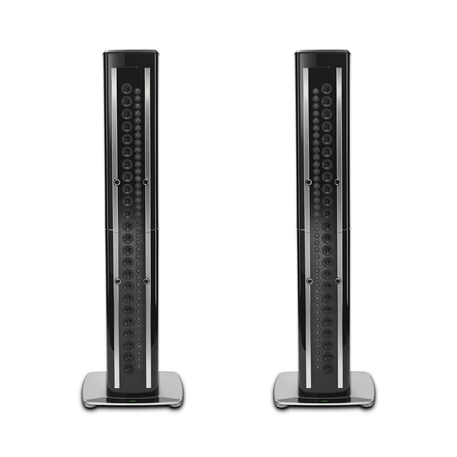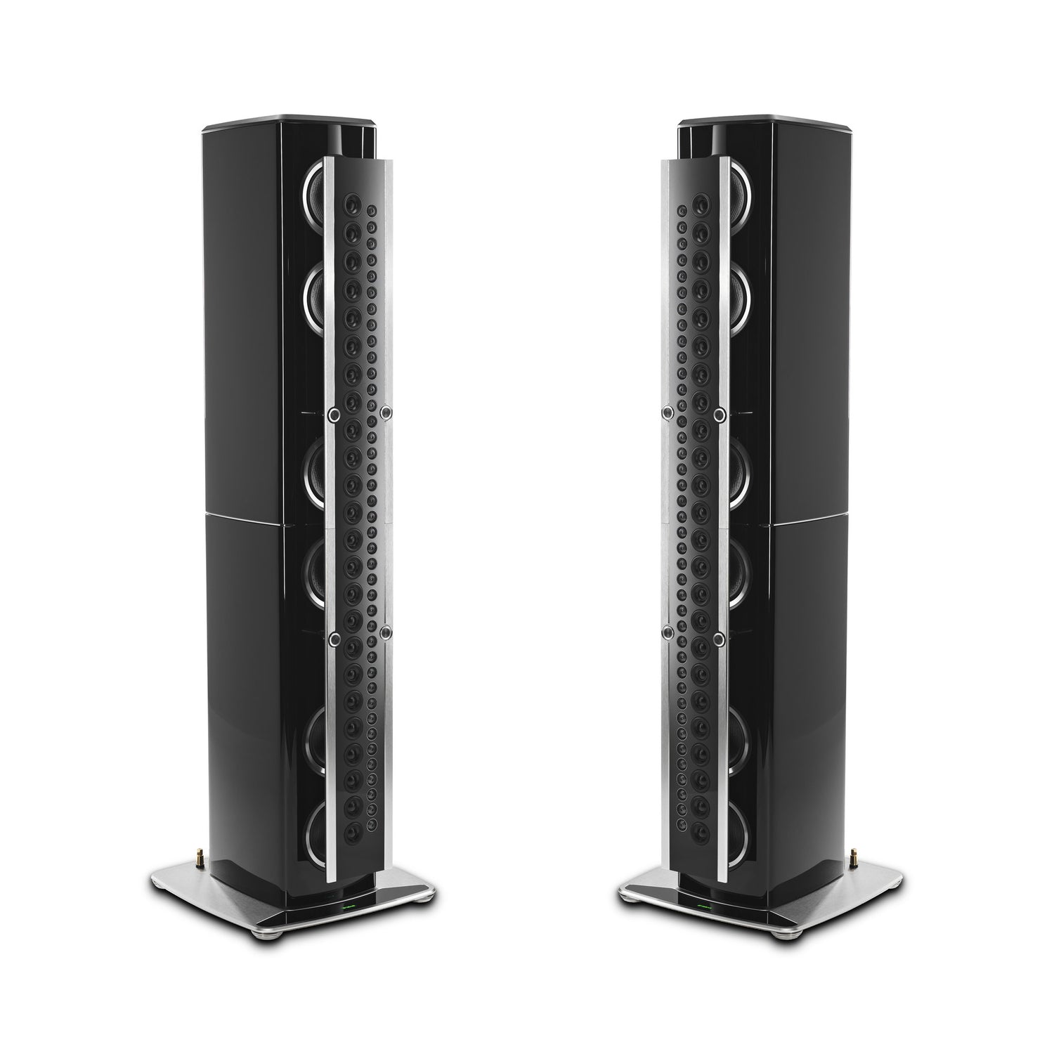 Sieben Schichten Klavierlack, Aluminium‑Akzente und eine schwebend montierte Array‑Säule verbinden Ästhetik mit Akustik. Drei Solid‑Cinch‑Terminal‑Paare ermöglichen Bi‑ oder Tri‑Wiring / Tri‑Amping.