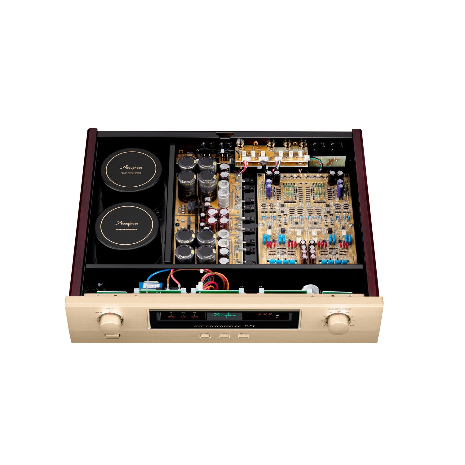 Vom Eingang bis zum Ausgang ist die C-57 konsequent symmetrisch aufgebaut. Die spiegelbildliche Führung unterdrückt Gleichtaktstörungen wirkungsvoll und bewahrt feinste musikalische Details.