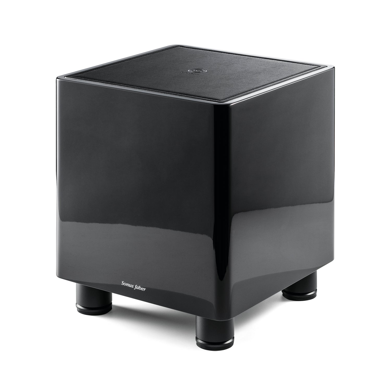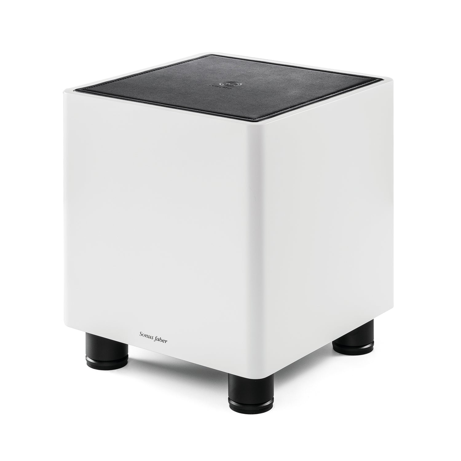 Lederbezogene Topplatte mit Sonus-faber-Prägung und vier Oberflächen (Walnut, Wenge, Matte White Lacquer, Piano Black). Die Entkopplung erfolgt über ein Gummipad; das quadrische Gehäuse fügt sich unaufdringlich ins Interieur.