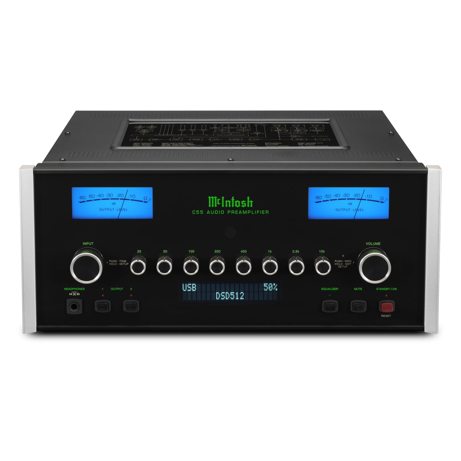 Per Ethernet verbindet sich der C55 mit der McIntosh Connect‑App für Lautstärke‑, Ein‑ und Ausgangswahl sowie Firmware‑Updates und Control4‑Integration.