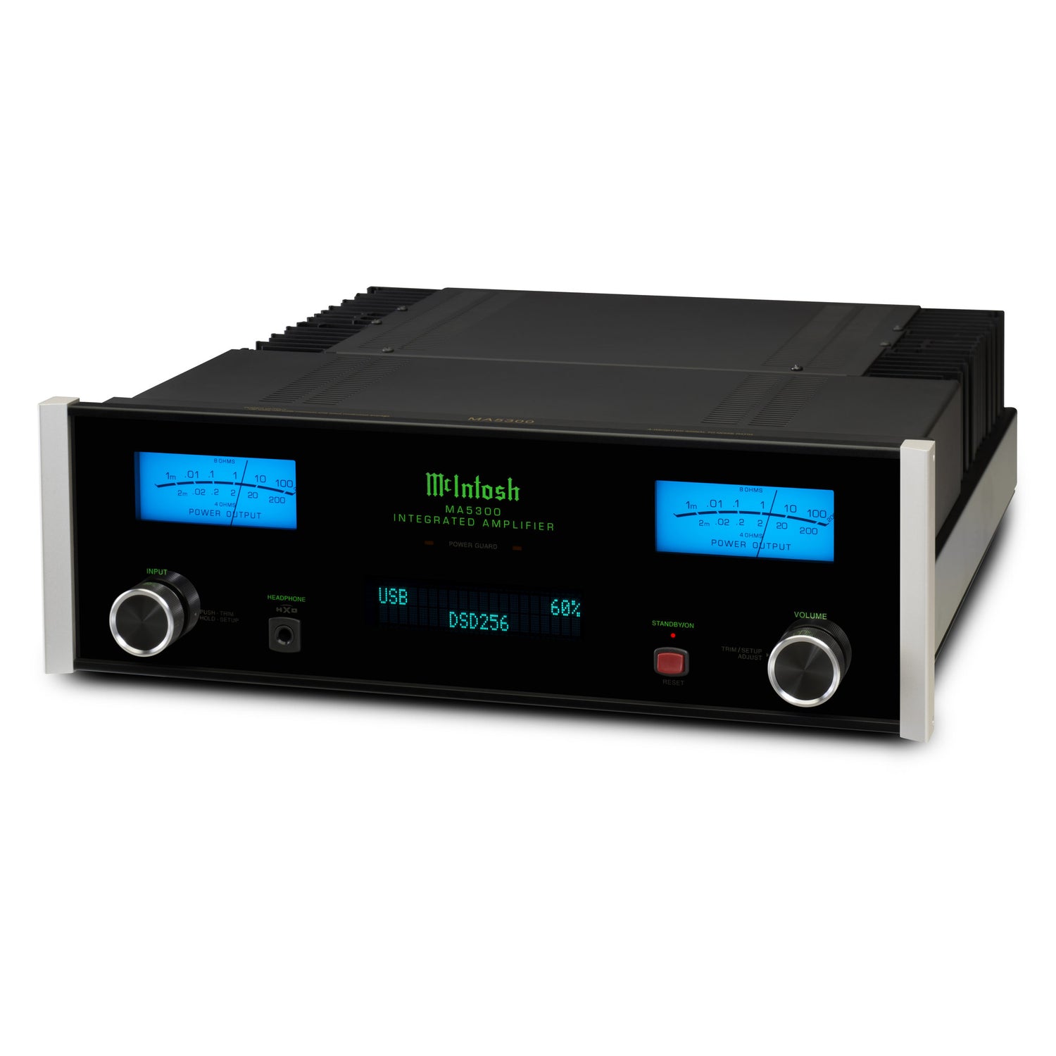 Der MA5300 ist McIntoshs kleinster Solid‑State Vollverstärker. Seine direct‑coupled Endstufe stellt 100 W pro Kanal an 8 Ω und 160 W an 4 Ω bereit und behält selbst an kritischen Lasten souveräne Kontrolle.