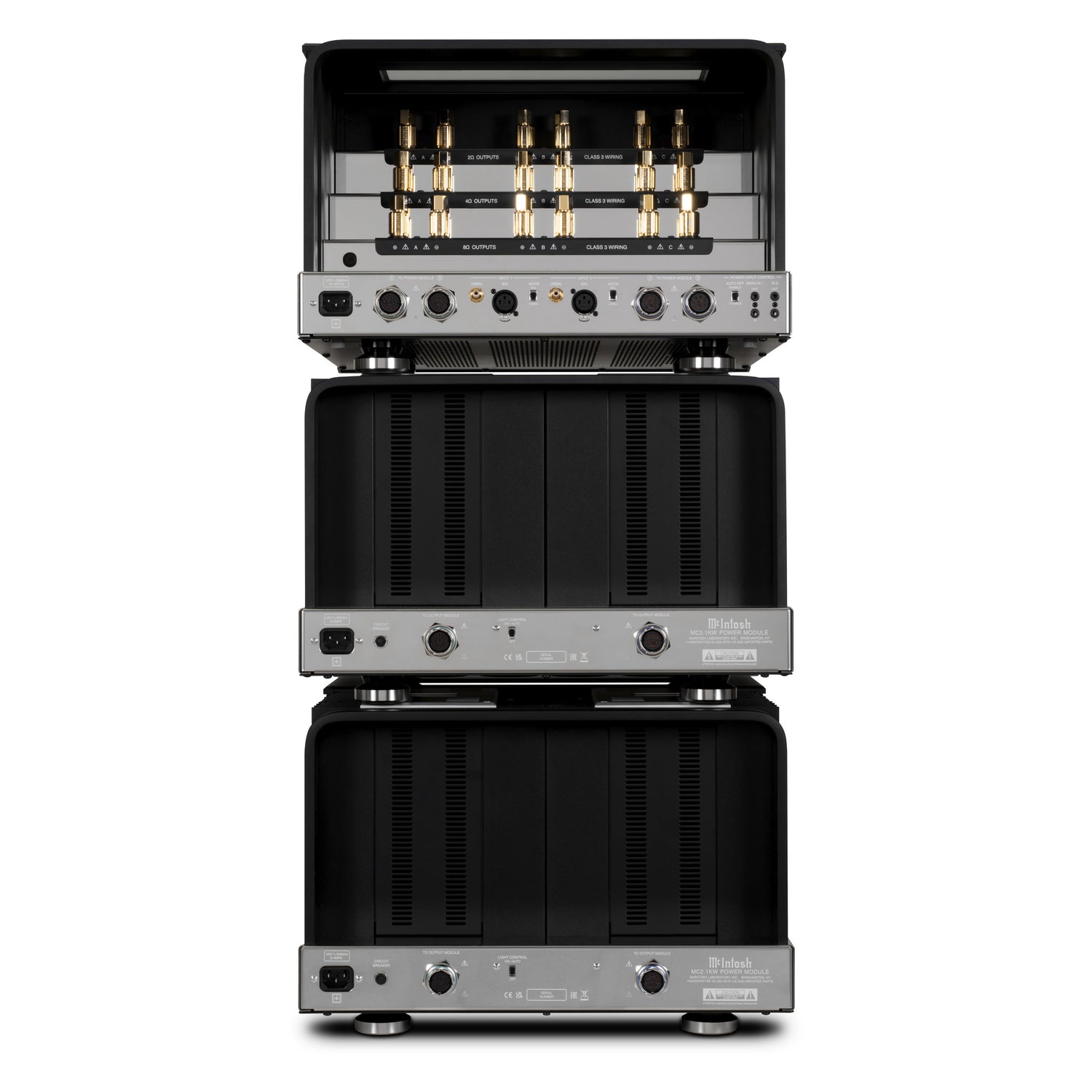 Drei Module – ein Output‑ und zwei Power‑Module – teilen sich Signalführung und Leistung. Das senkt das Gewicht je Gehäuse, vereinfacht die Aufstellung und erlaubt den Betrieb an normalen Netzanschlüssen.