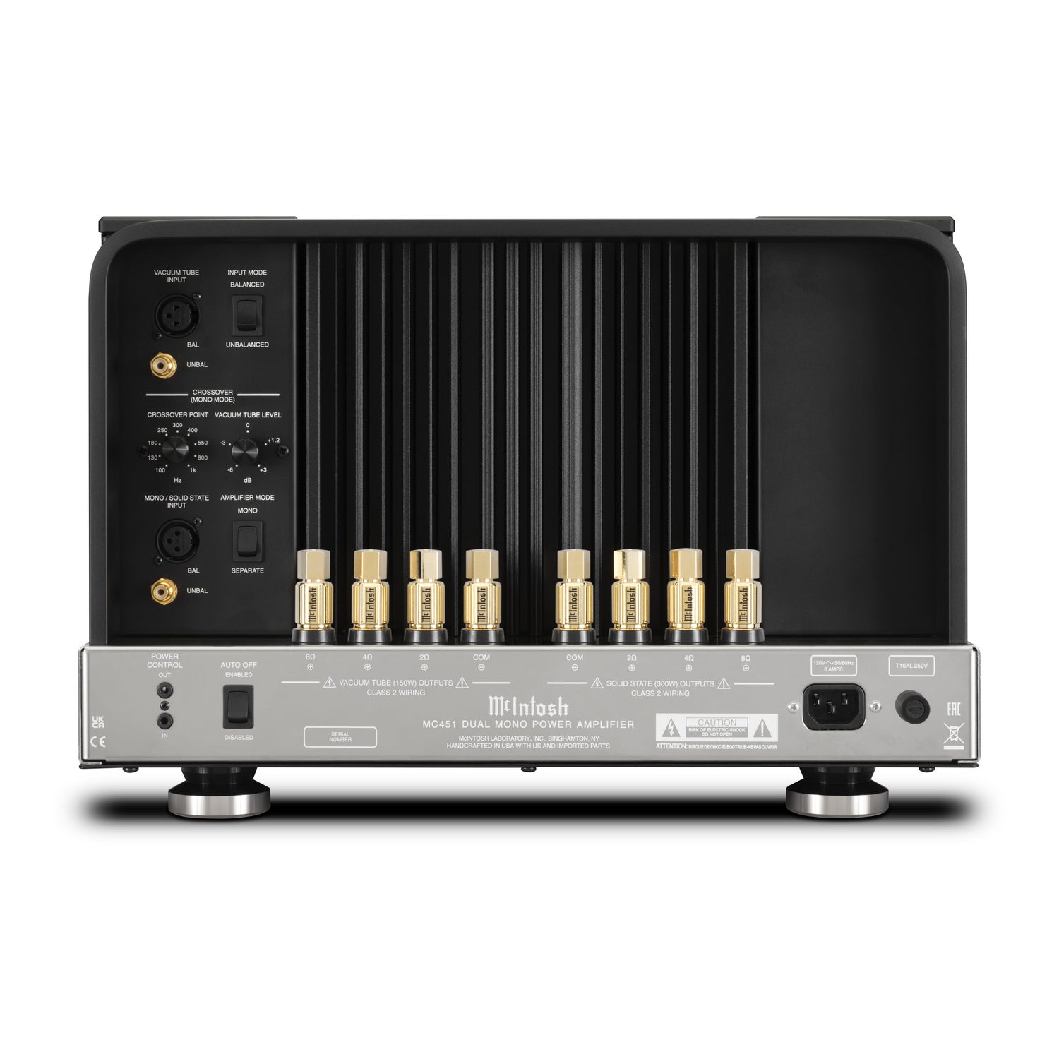 Der MC451 vereint einen 150 W Röhren‑ und einen 300 W Transistor‑Verstärker in einem Gehäuse. Beide Sektionen sind durch eine interne, stufenlos einstellbare Frequenzweiche perfekt aufeinander abgestimmt – einfaches Bi‑Amping ohne externe Crossover.