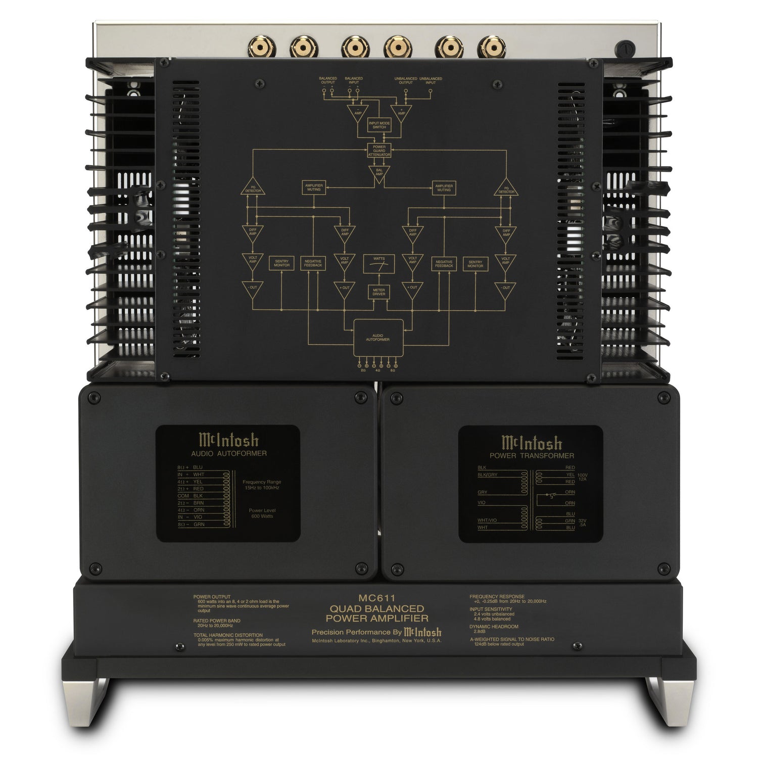 Der MC611 liefert dank McIntosh Autoformer bei 2, 4 oder 8 Ohm stets volle 600 W pro Kanal und behält auch an fordernden Lautsprechern souveräne Kontrolle.