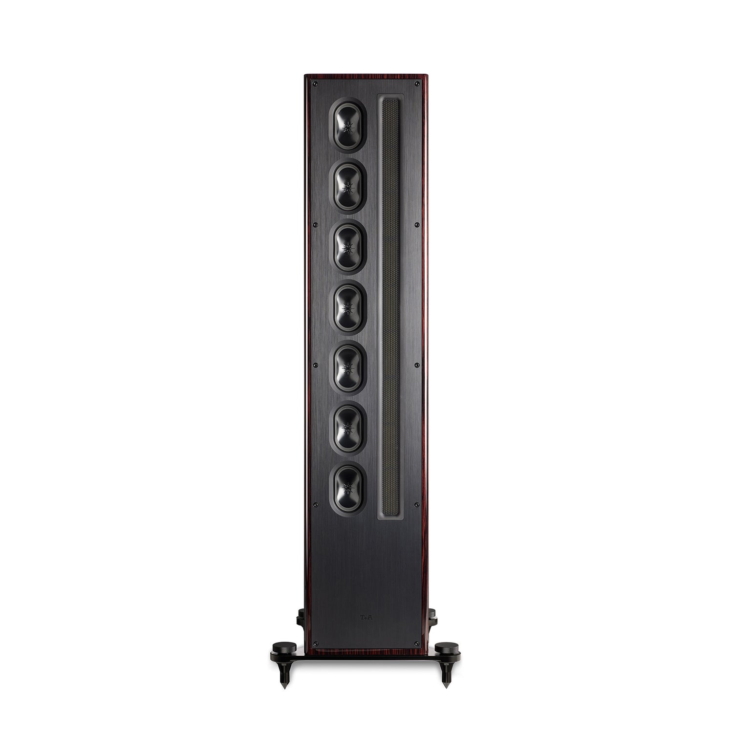 Der 85-cm-Magnetostat wird von 64 Hochleistungsmagneten angetrieben; sein großflächiger Leiter arbeitet über die gesamte Fläche linear. Zusammen mit der eng gekoppelten Siebener-Mitteltonlinie entsteht eine planare Abstrahlung, die Energie gezielt in den Hörbereich bündelt und Raumreflexionen stark reduziert.