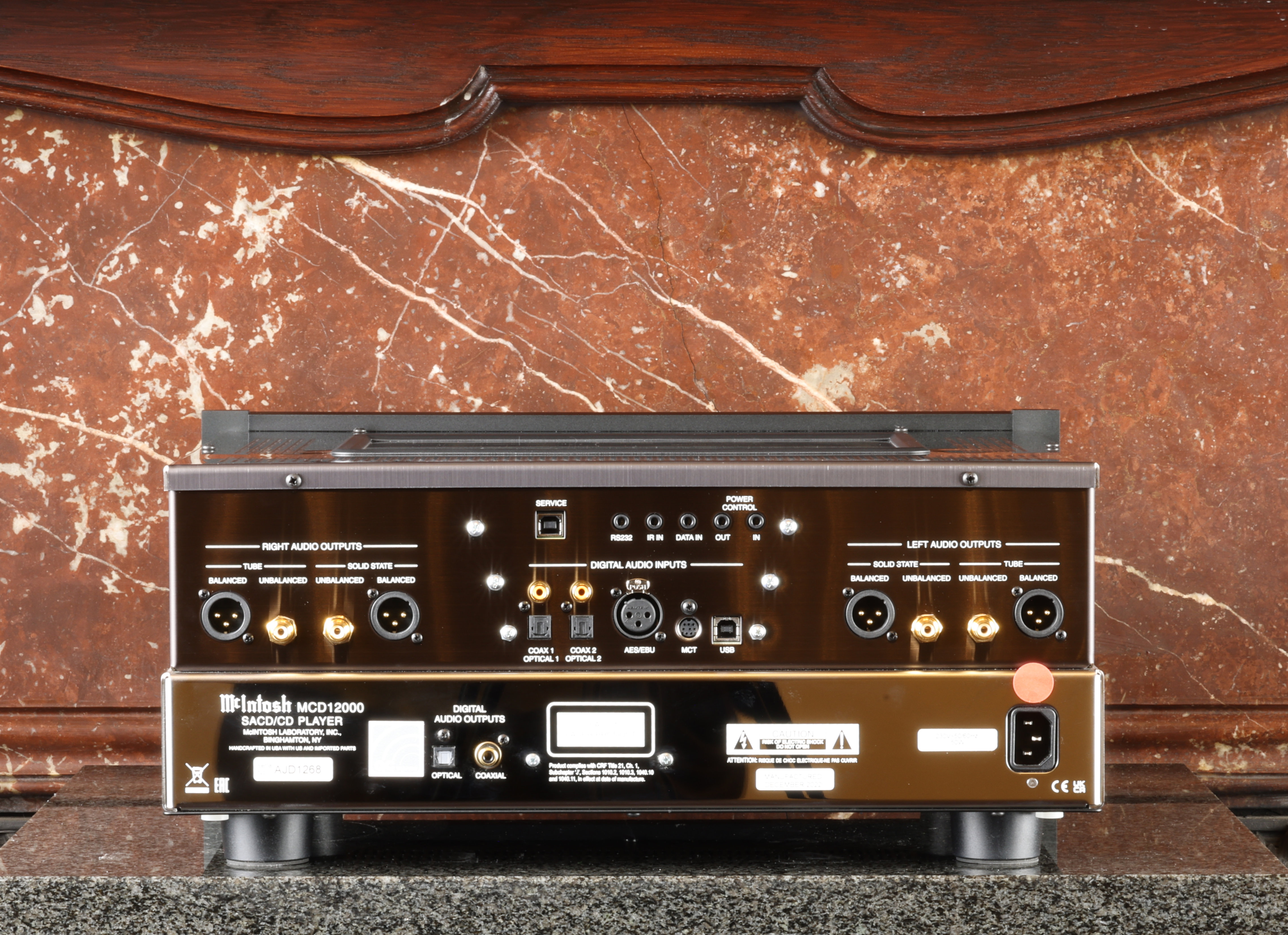 Alle Ausgänge werden von diskreten Verstärkern oder einer Mischung aus Vakuumröhren und diskreten Verstärkern betrieben. Für den Röhrenausgang sind dem linken und rechten Audiokanal jeweils eine 12AT7- und eine 12AX7A-Röhre zugeordnet. Der Festkörperausgang erfolgt über einen diskreten symmetrischen Operationsverstärker. Ein digitaler Koaxial- und ein optischer Ausgang sorgen für zusätzliche Flexibilität beim Anschluss des MCD12000 an das restliche Audiosystem Ihres Hauses.